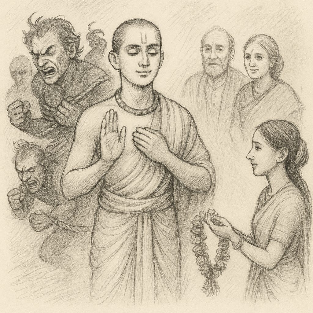 Ktoś mógł być bardzo bezbożny w poprzednim życiu i dlatego ma karmę cierpienia w życiu rodzinnym, ale służąc Krysznie i praktykując życie duchowe, Kryszna może postanowić to zmienić. Możliwości na tej ścieżce są o wiele większe niż próba uwiedzenia przypadkowej kobiety.